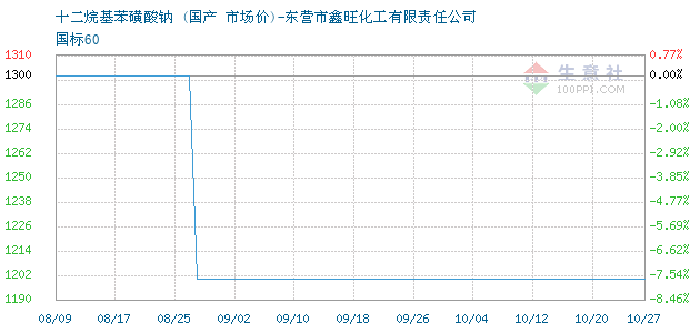 | 国标60 附加说明:东营市鑫旺化工,十二烷基苯磺酸钠报价1300元/吨,化工产品价格变动频繁,详情欢迎来电咨询! |