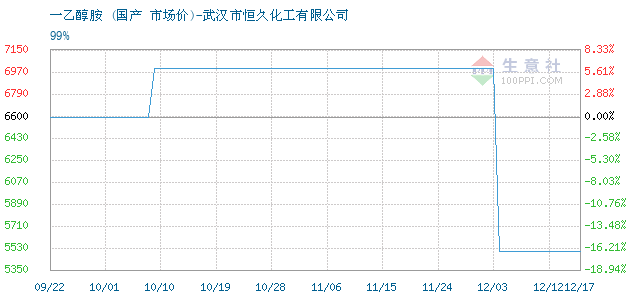 | 99% 附加说明:【 大宗原料价格波动较快,价格随行就市,实单致电:157-9198-4079 】一乙醇胺 广泛用于制备润滑剂、表面活性剂、冷却液和药物。 |
