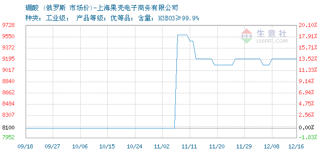 | 种类:工业级; 产品等级:优等品;含量:H3BO3≥99.9% 附加说明:由于化工产品行情走势变化较快,价格随行就市,实单采购请以电话询价为准。 |