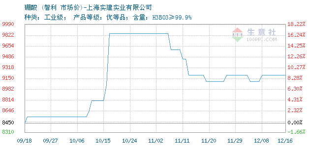 | 种类:工业级; 产品等级:优等品;含量:H3BO3≥99.9% 附加说明:由于化工产品行情走势变化较快,价格随行就市,实单采购请以电话询价为准。 |
