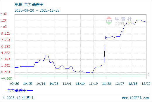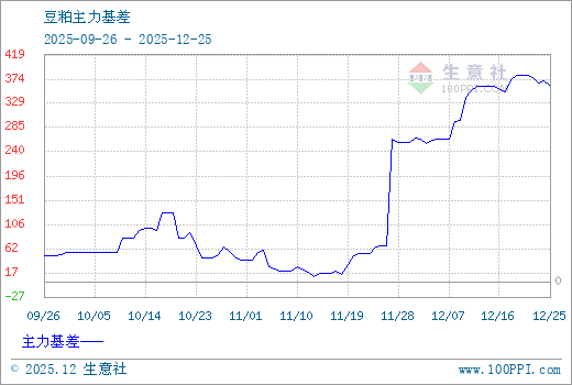 注: 1、从2025-09-26 至 2025-12-25期间,豆粕主力基差最大值为382.00,最小值为10.00。